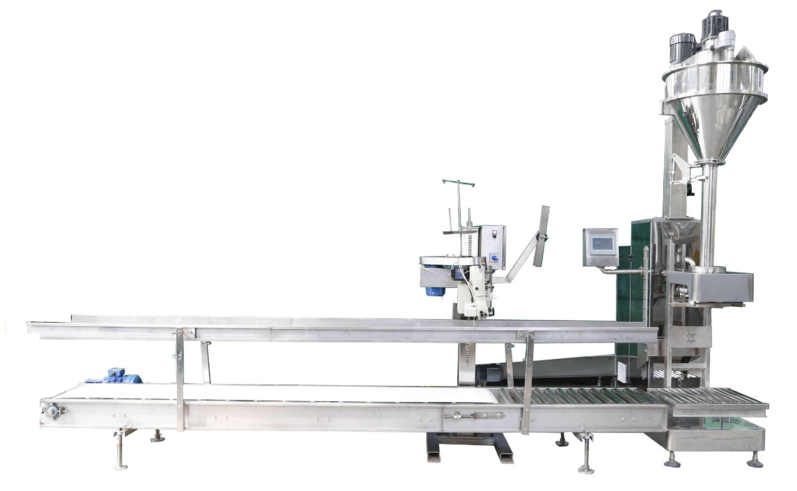- La poder hecha en la línea con los transportadores, máquina de coser, sellador del calor, transportador del semi-embalaje y el empaletar del bolso de la caída, formando de nuevo el transportador, inspector de peso, rechaza el transportador, revista de plataforma, apilador.