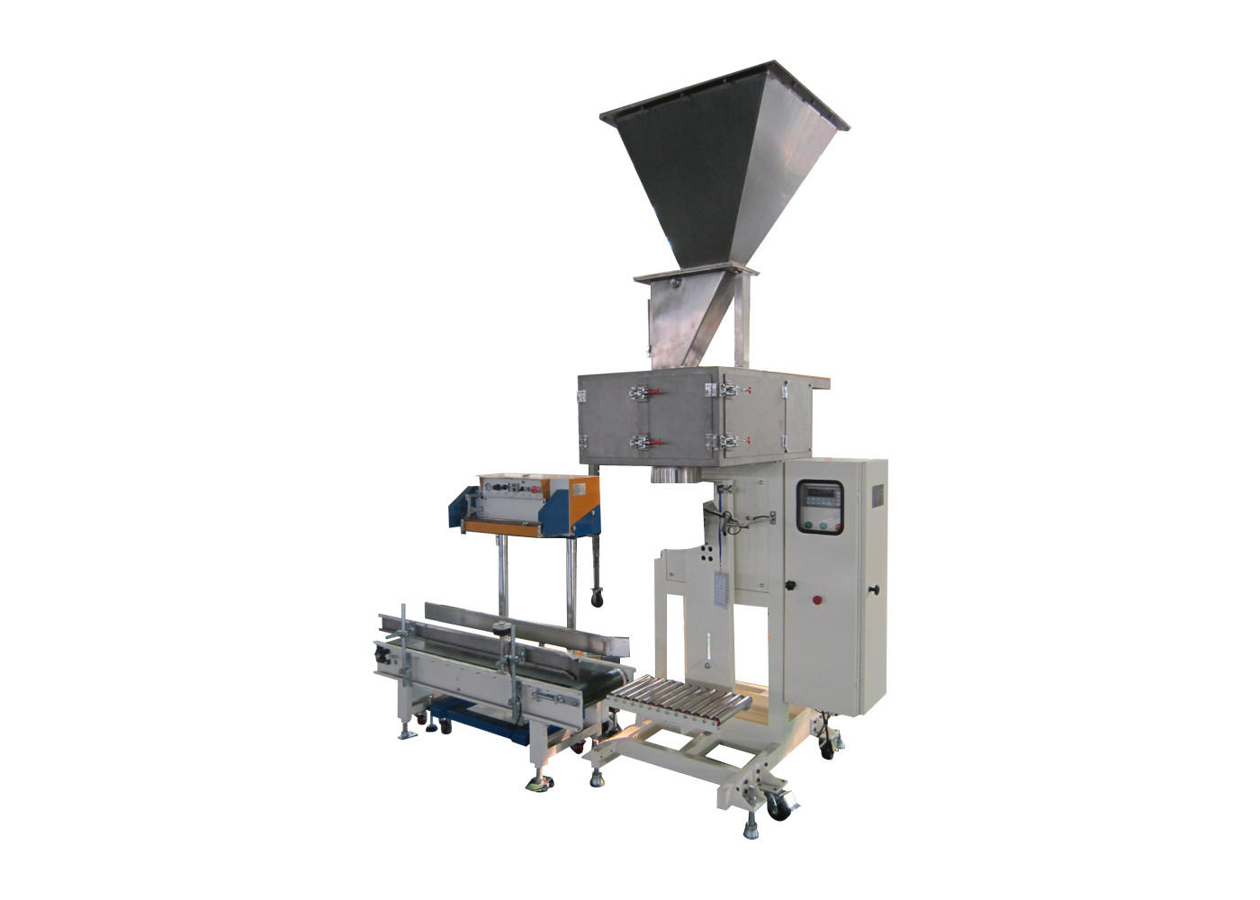 La escala que embala electrónica consiste en el pesar de la unidad, máquina de coser, transportando el dispositivo, sistema neumático, sistema del retiro de polvo, control que embala cuantitativo, el etc. el proceso de pesaje entero es controlado por el PLC y terminado automáticamente.